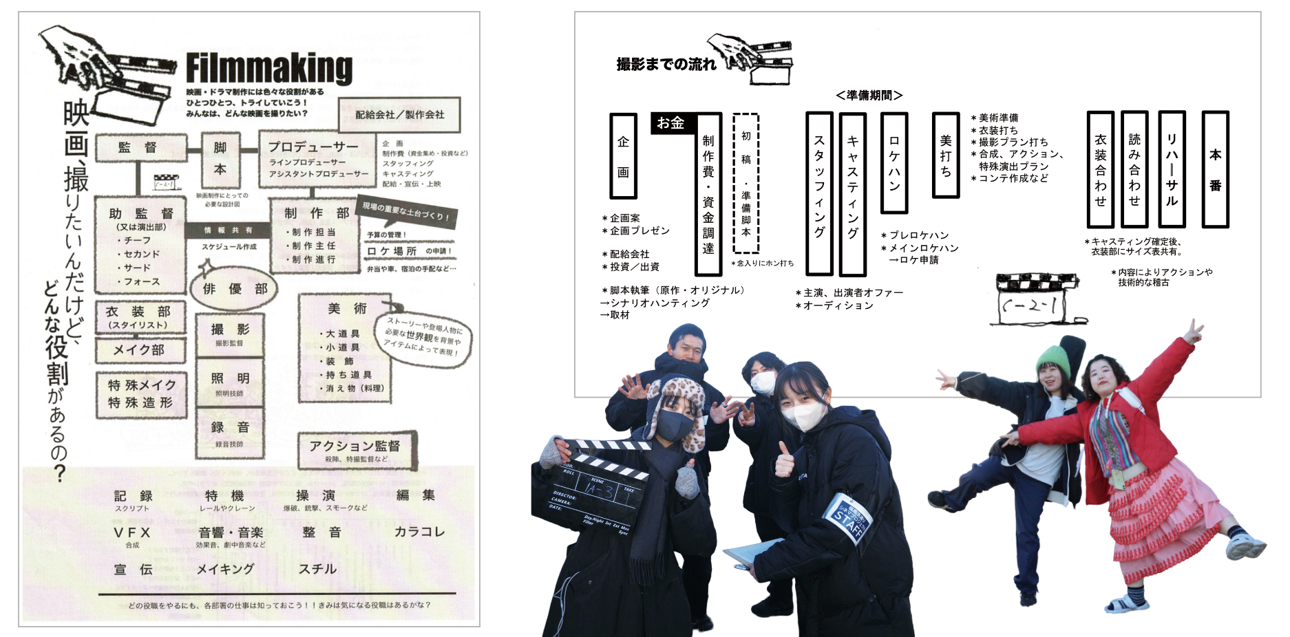 今回は映画づくりの現場に立ち会った経験者が多いものの、全体的な流れや細かな役割を知らない人がほとんど。映画づくりの資料をもとに「どんな部署・役割があるのか」の説明が行われた。改めて、映画の企画・制作・上映に至るまで多くの人がかかわっているのがよくわかる。